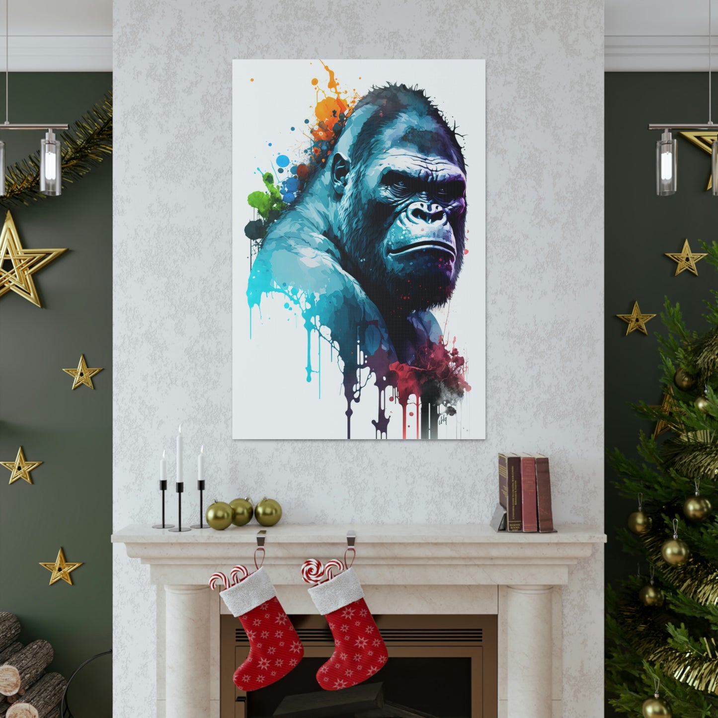 The gorilla, often associated with leadership and authority, emerges from the vibrant canvas, providing insight into the contrast between his might and tranquility.